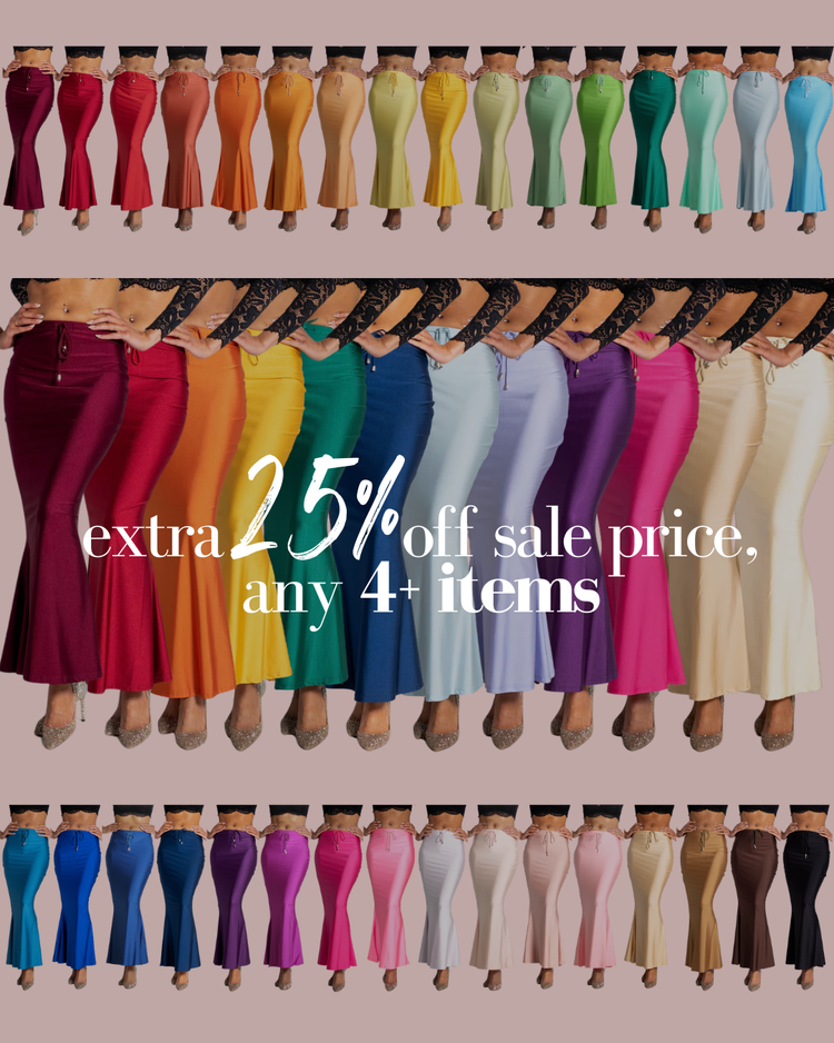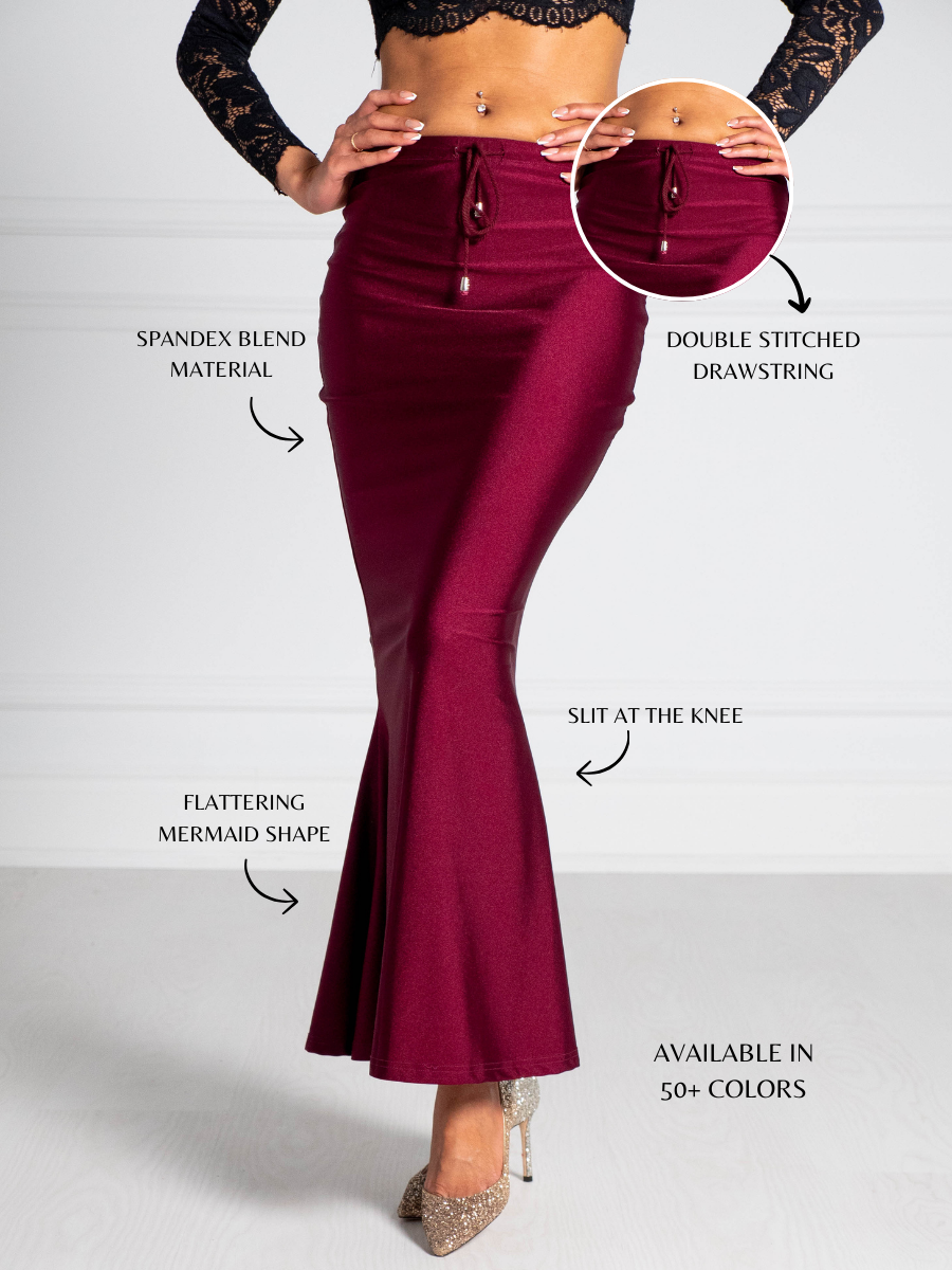 The Saree Silhouette™ is a stretch shapewear underskirt that replaces the traditional cotton petticoat. It hugs your figure, creates a beautiful mermaid shape, and lets you move freely all day long.
