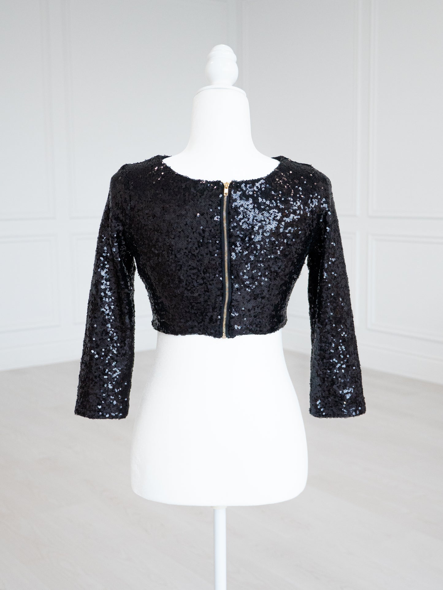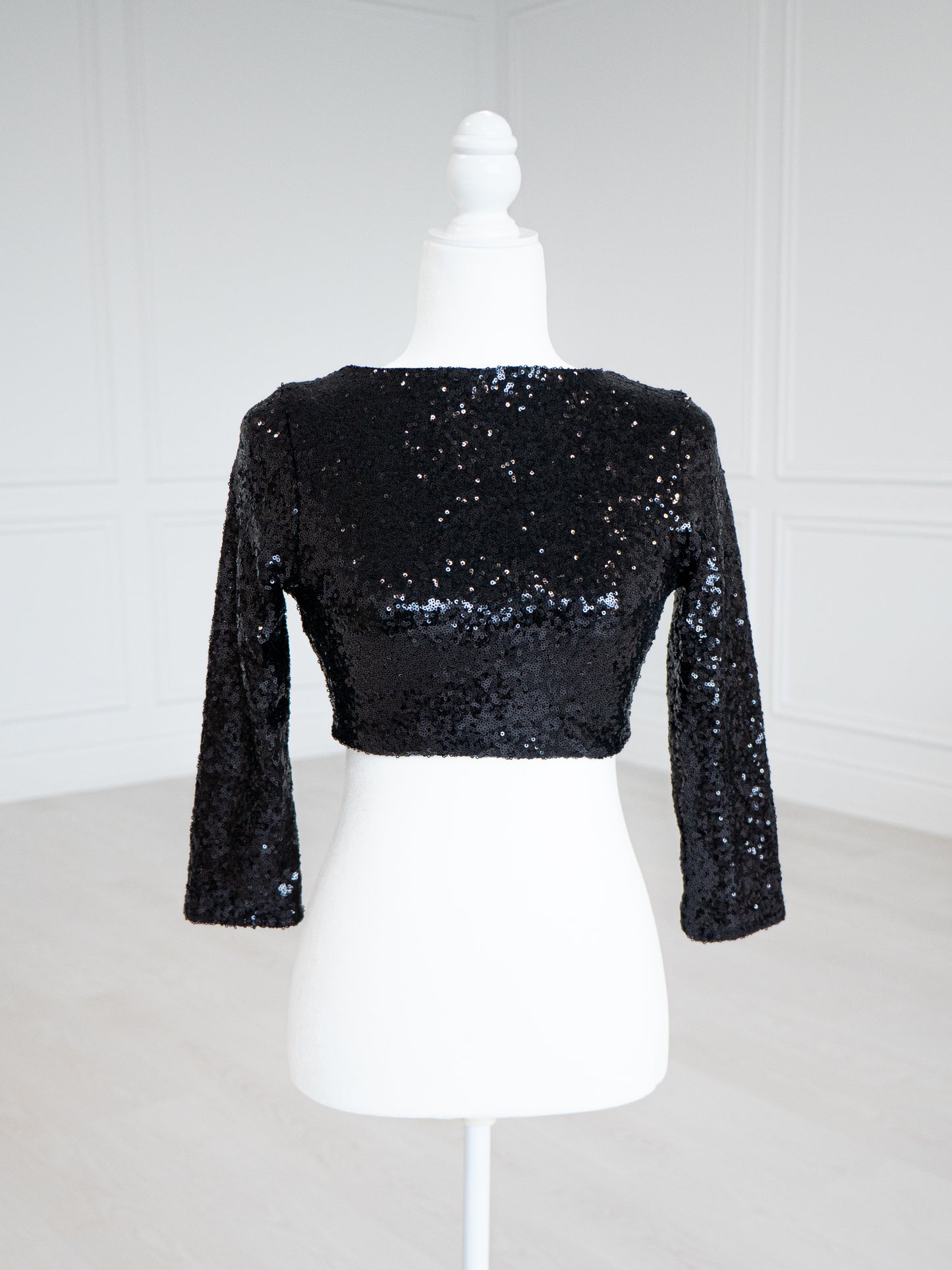 Birthday Crop: 1. Sequin shine, 2. High neck and three quarter sleeves, 3. Reversible and breastfeeding friendly. Perfect for weddings and parties.