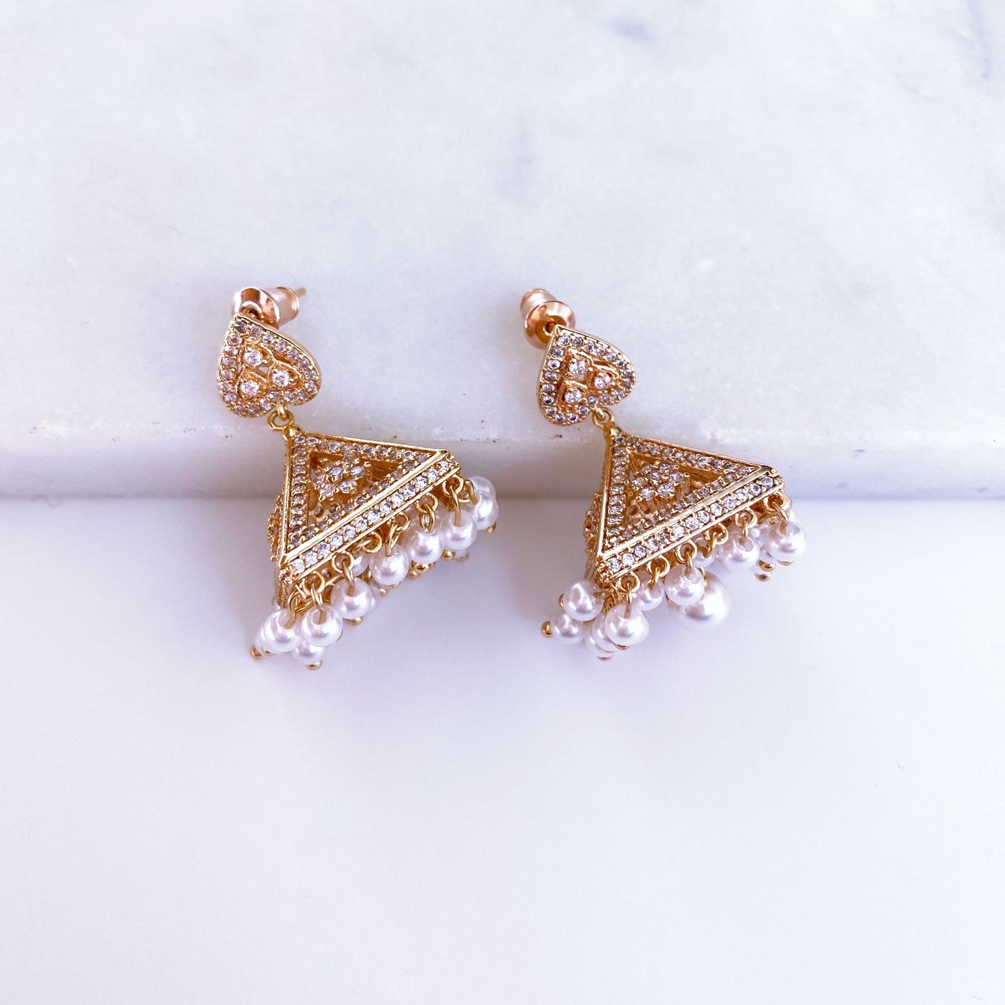 Egypt Earrings: 1. Rose gold finish, 2. Triangle jhumka with heart stud, 3. Crystal and pearl accents. Ideal for weddings and festive wear.