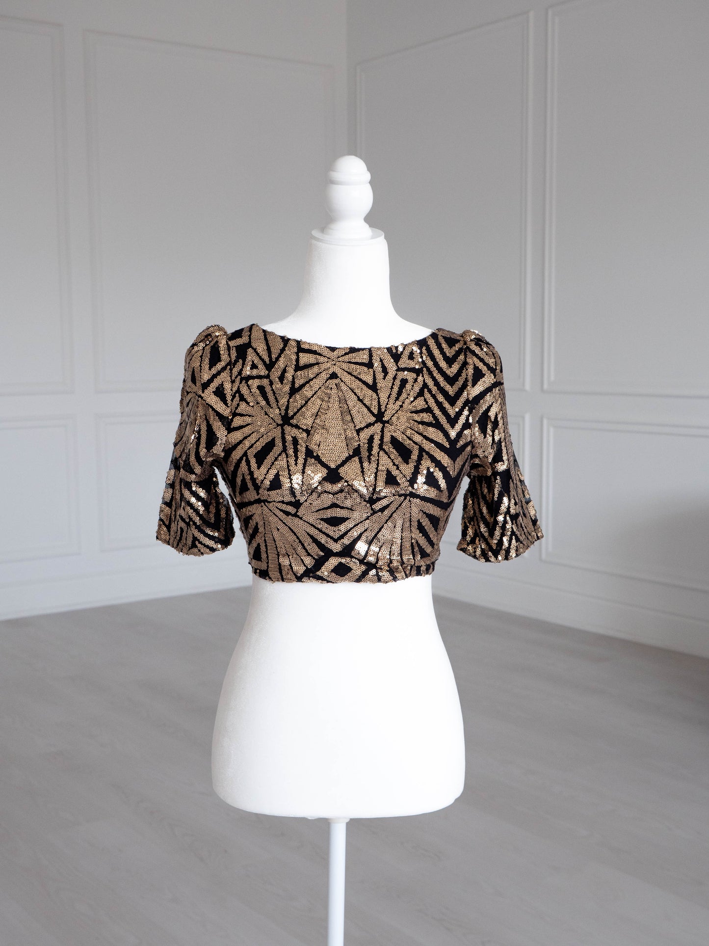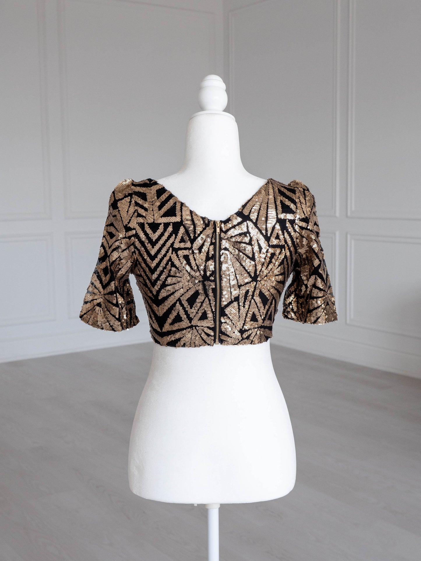 Phoenix Crop: 1. Geometric sequins, 2. High neck and three quarter sleeves, 3. Silk lined crop blouse. Perfect for receptions and parties.