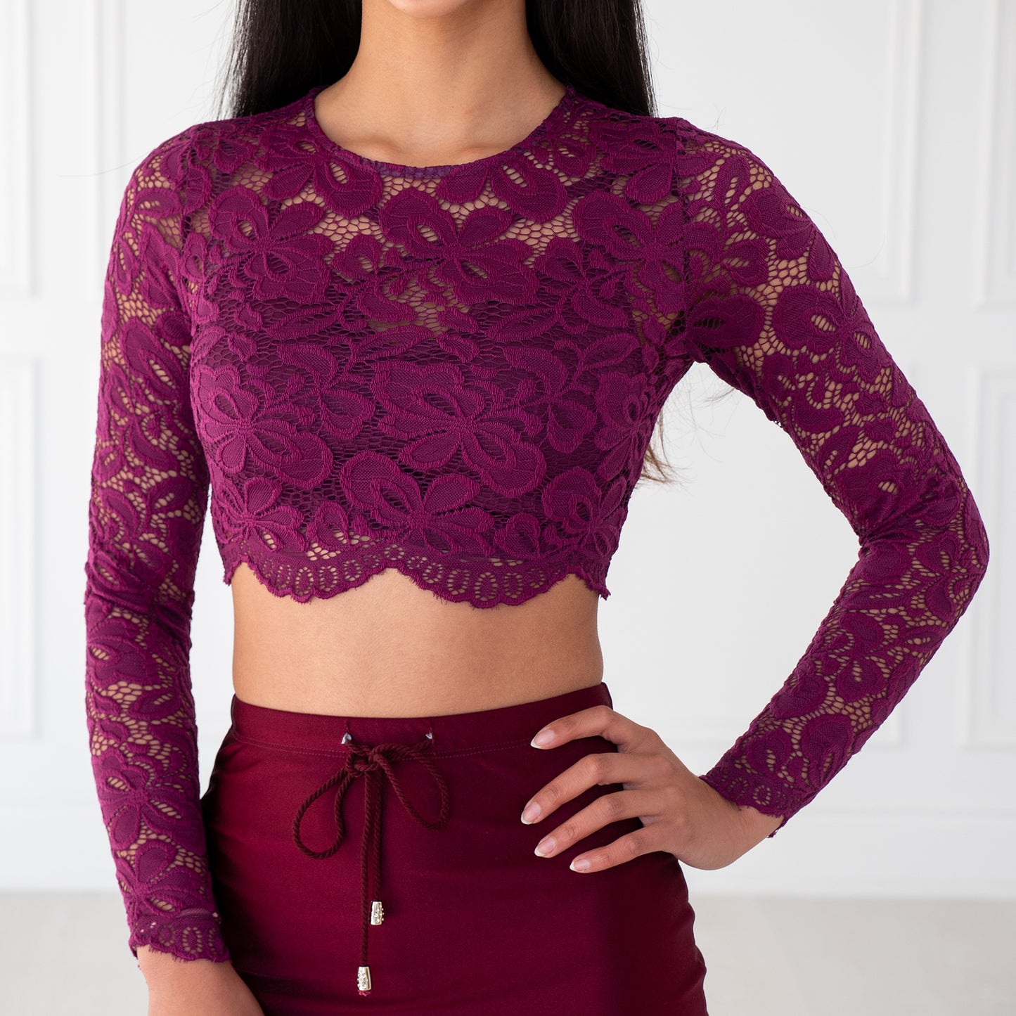 Long Sleeve Lace Crop: 1. Stretch lace, 2. Round neck, 3. Sheer lace sleeves with cami lining. Perfect for weddings and receptions.