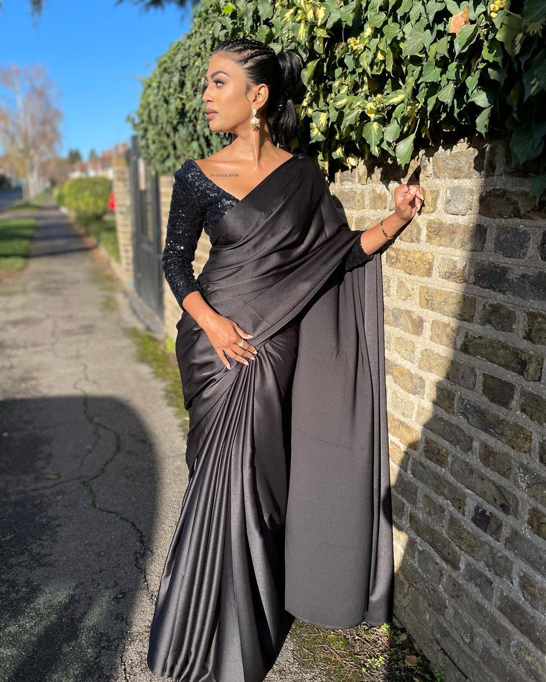 Luxe Saree: 1. Satin silk fabric, 2. Smooth easy pleats, 3. Flowy finish. Ideal for weddings, parties, and bridesmaids.