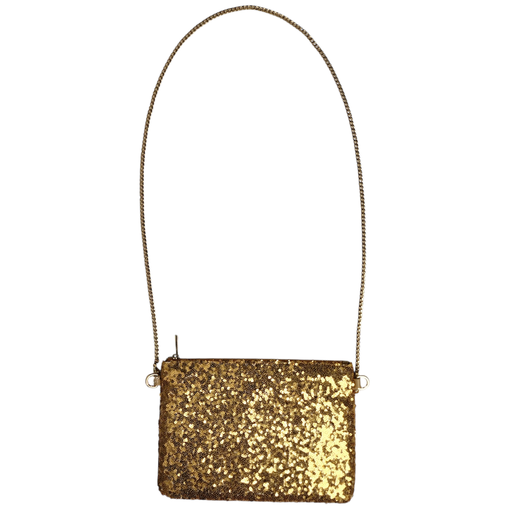 Sequin Clutch: 1. 7"x10" size, 2. Detachable 43" chain doubles as waist chain, 3. Gold sequin finish. Perfect for weddings, parties, and festive looks.