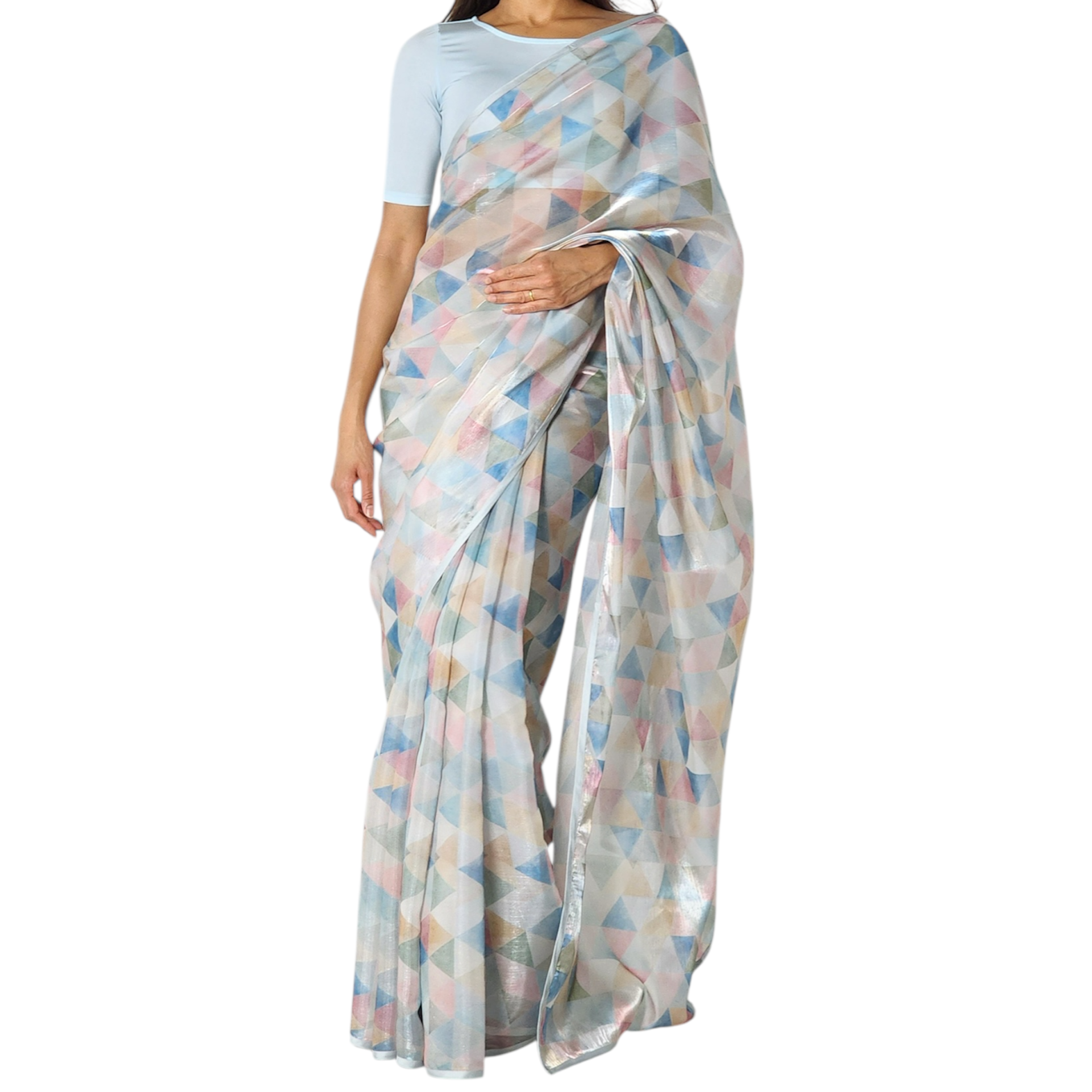 Custom Print Organza Saree: 1. Satin silk border, 2. Smooth easy pleats, 3. Flowy finish. Ideal for weddings, parties, and bridesmaids.