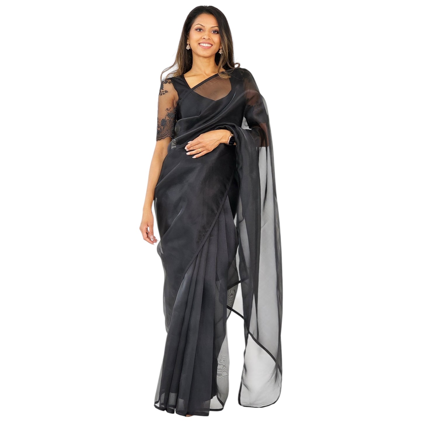 Elevate your wardrobe with this lightweight organza saree with a satin border. Crafted from premium organza fabric, this saree drapes beautifully, offering a comfortable and airy feel that's perfect for any occasion.