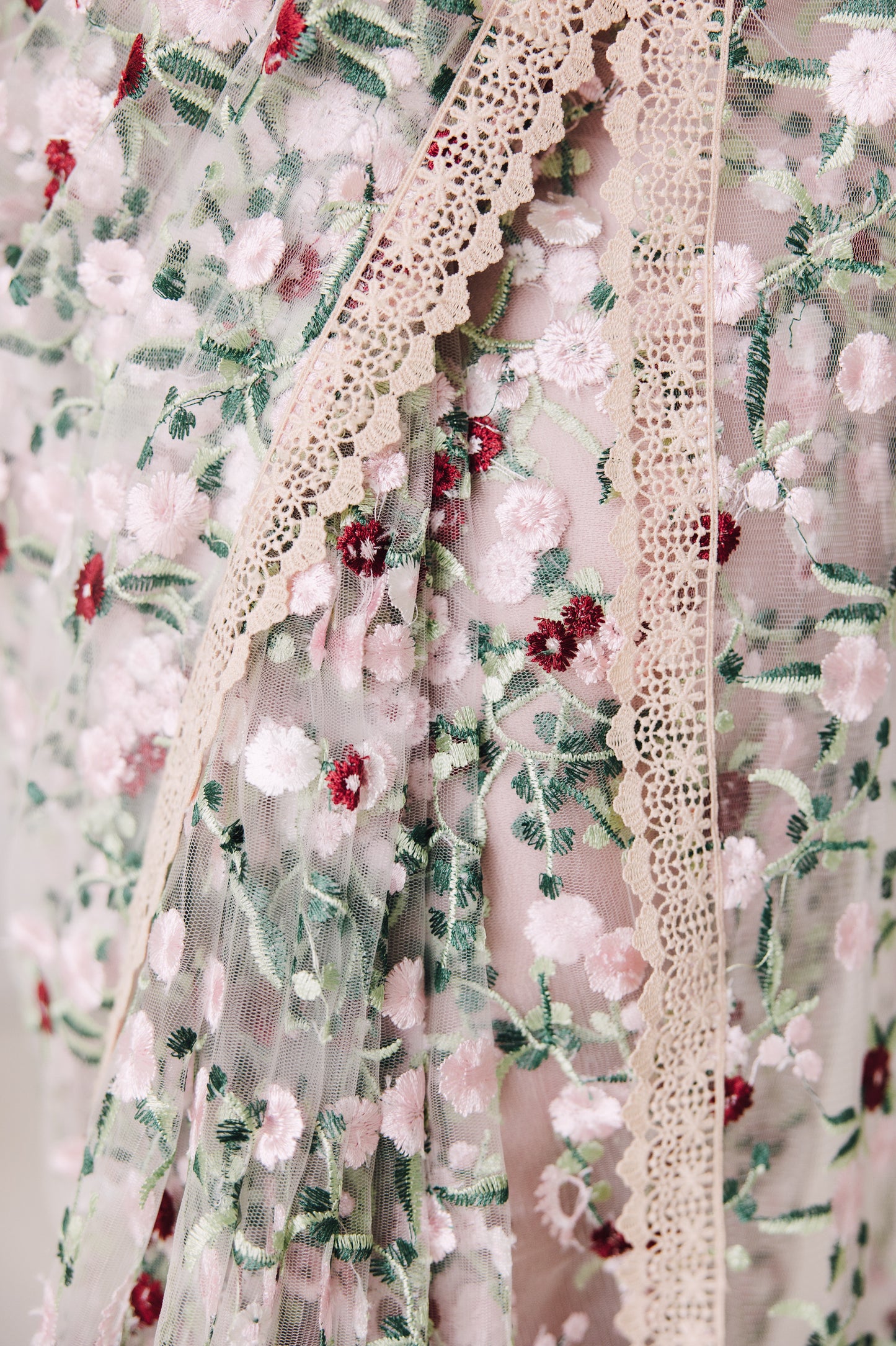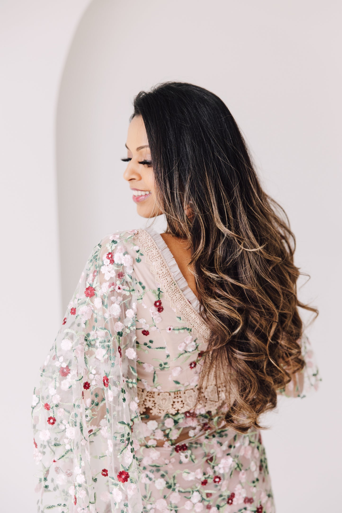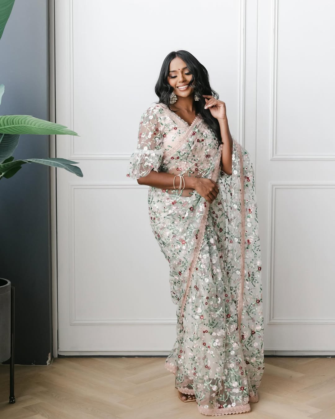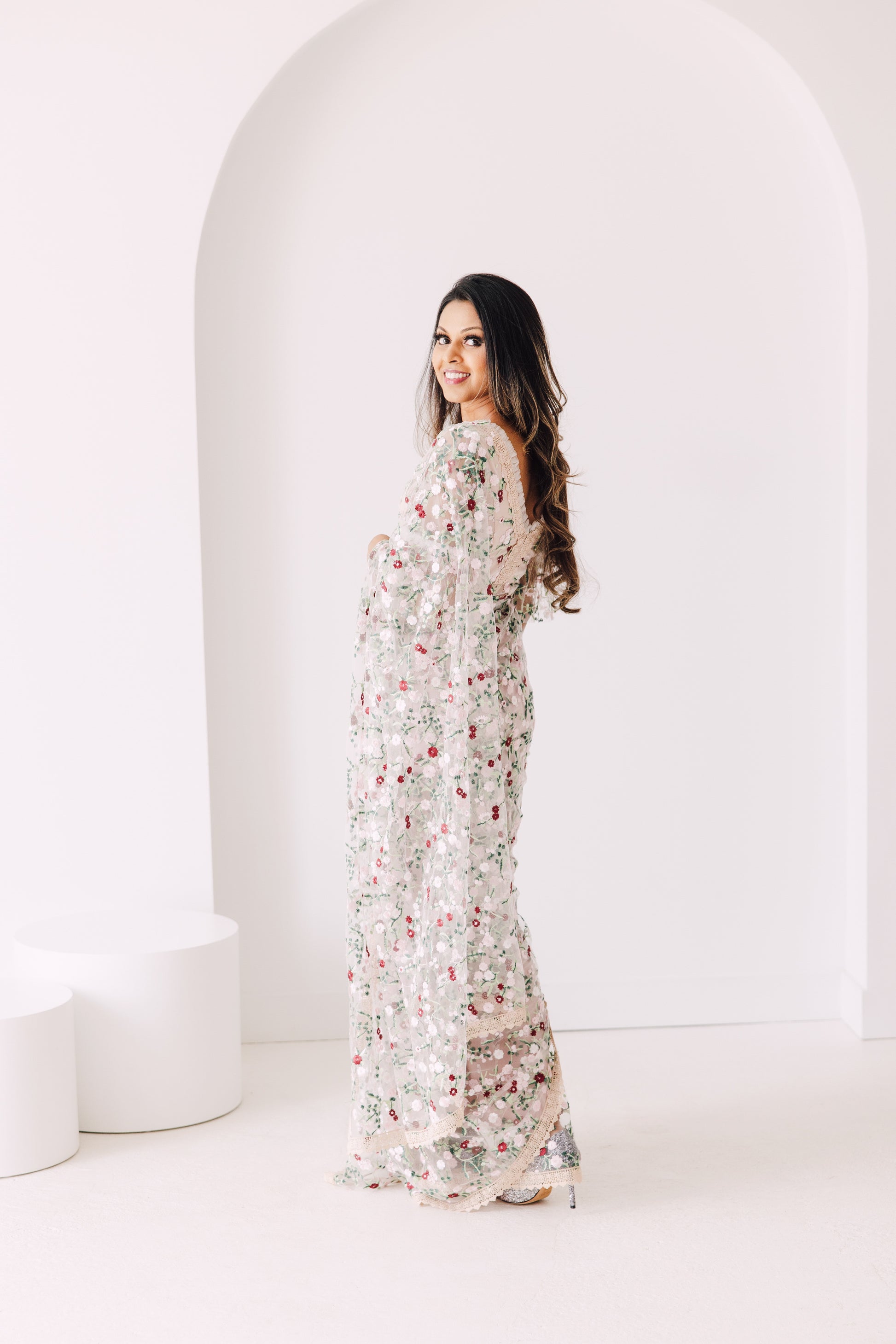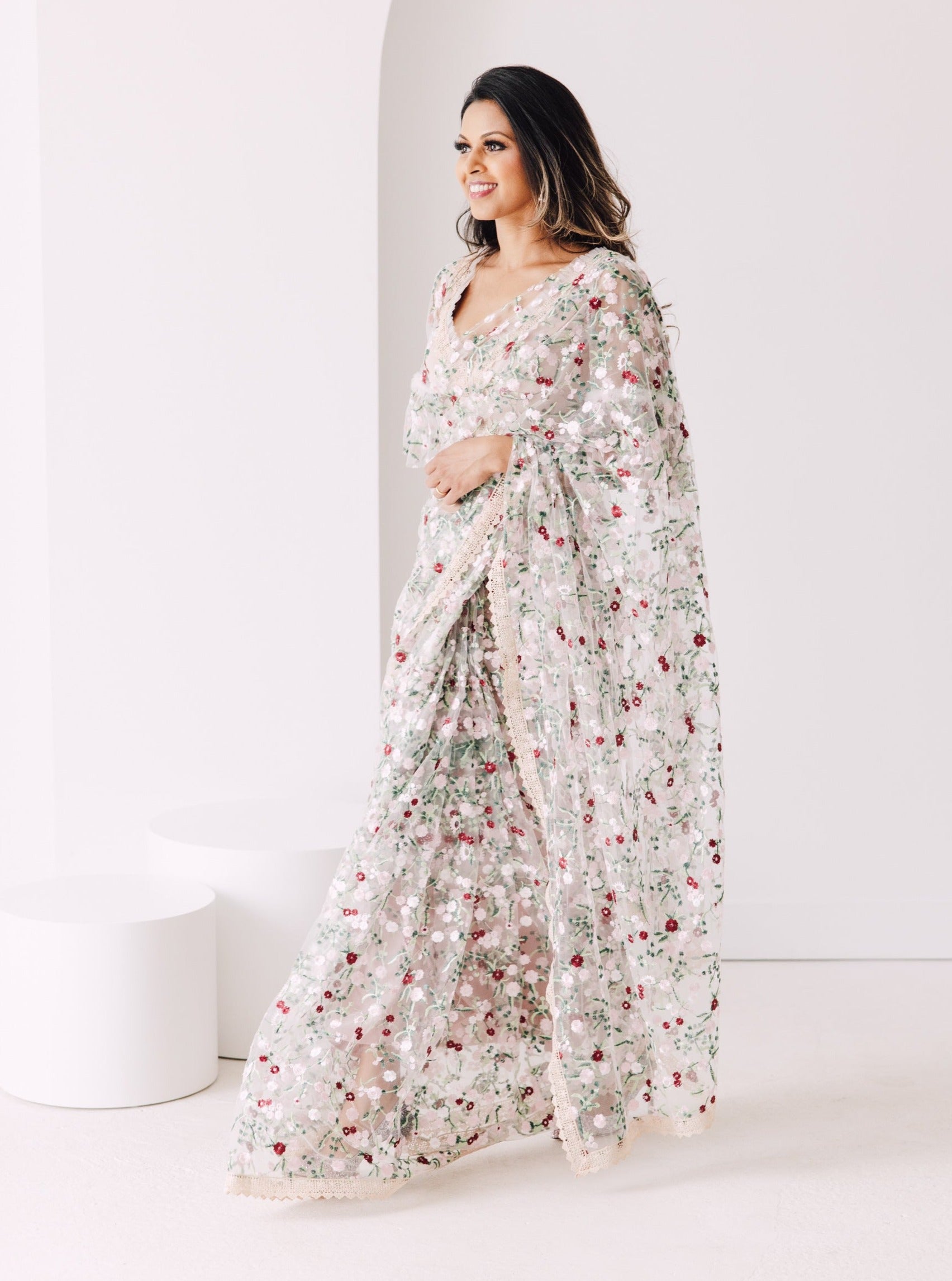 Introducing the Zahara Saree. This saree features embroidery and lace borders. The fluid fabric makes for an easy and beautiful draping experience.