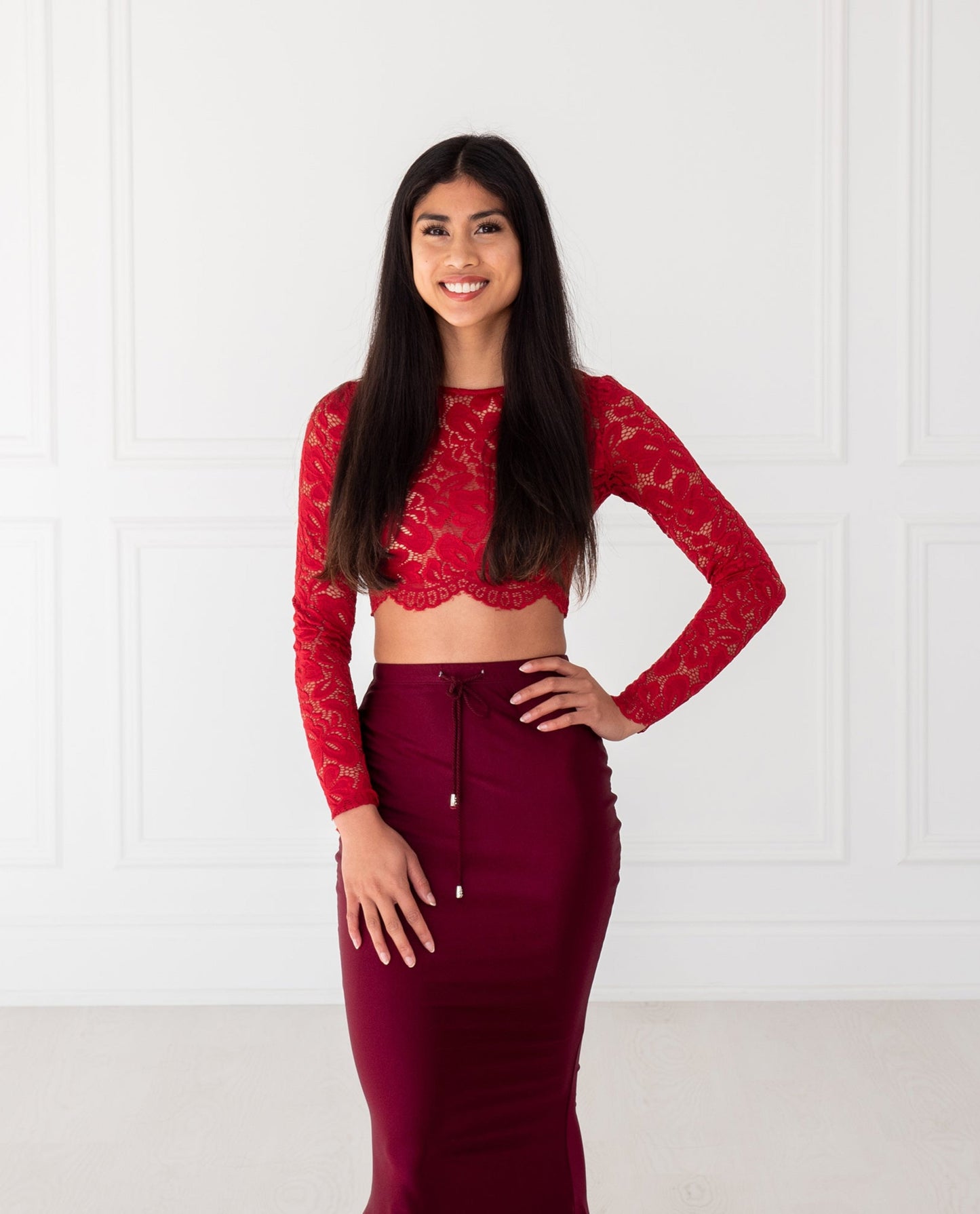 Long Sleeve Lace Crop: 1. Stretch lace, 2. Round neck, 3. Sheer lace sleeves with cami lining. Perfect for weddings and receptions.